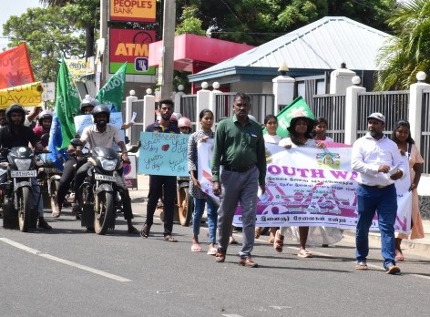 இதன் போது இளைஞர்கள் போதைப்பொருள் பாவனைக்கு எதிராகவும், சுற்றுச்சூழலை பாதுகாக்கும் விதமாகவும் பல பதாகைகள் ஏந்தி வீதி வழியாக தமது பேரணியை மேற்கொண்டனர்.