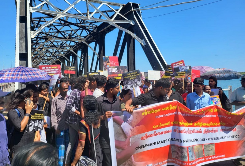 செம்மணி மனிதப்புதைகுழிகள் தழின அழிப்புக்கு சான்று என்றும் ஸ்ரீலங்காவை சர்வதேச குற்றவியல் நீதிமன்றில் பாரப்படுத்துமாறும் வடக்கு, கிழக்கில் இருந்து இராணுவத்தை வெளியேற்றுமாறும் காணாமல் ஆக்கப்பட்டோருகு்கு நீதி கேட்டும் ஆர்ப்பாட்டத்தில் ஈடுபட்டவர்கள் கோரிக்கை விடுத்தனர்.