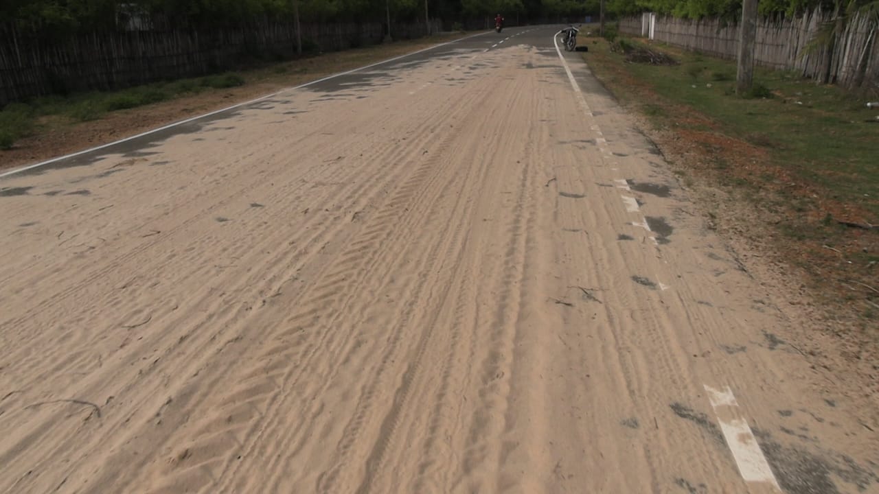 மணல் கடத்தல் முறியடிப்பு; பளை – சோரன்பற்று வீதியில் குவியல் குவியலாக மணல்